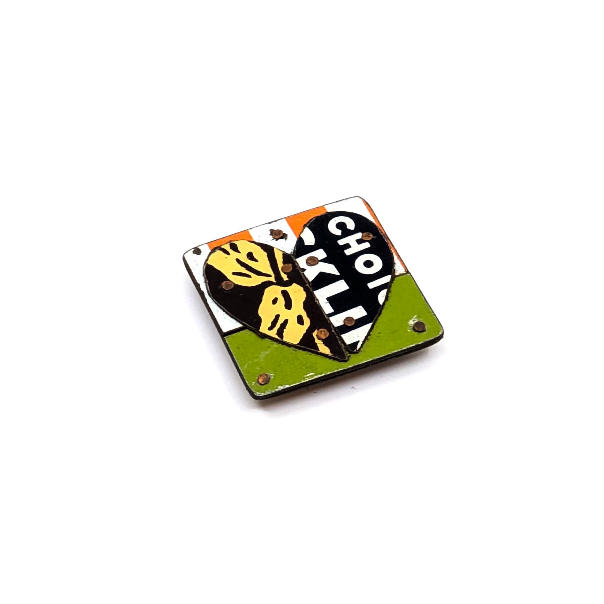These pieces are made by piecing together various metals and shapes from vintage tin! They have a similar feel as quilts and collages. All brooches include a detachable magnet on the back for easy wear without creating a hole in your clothing!