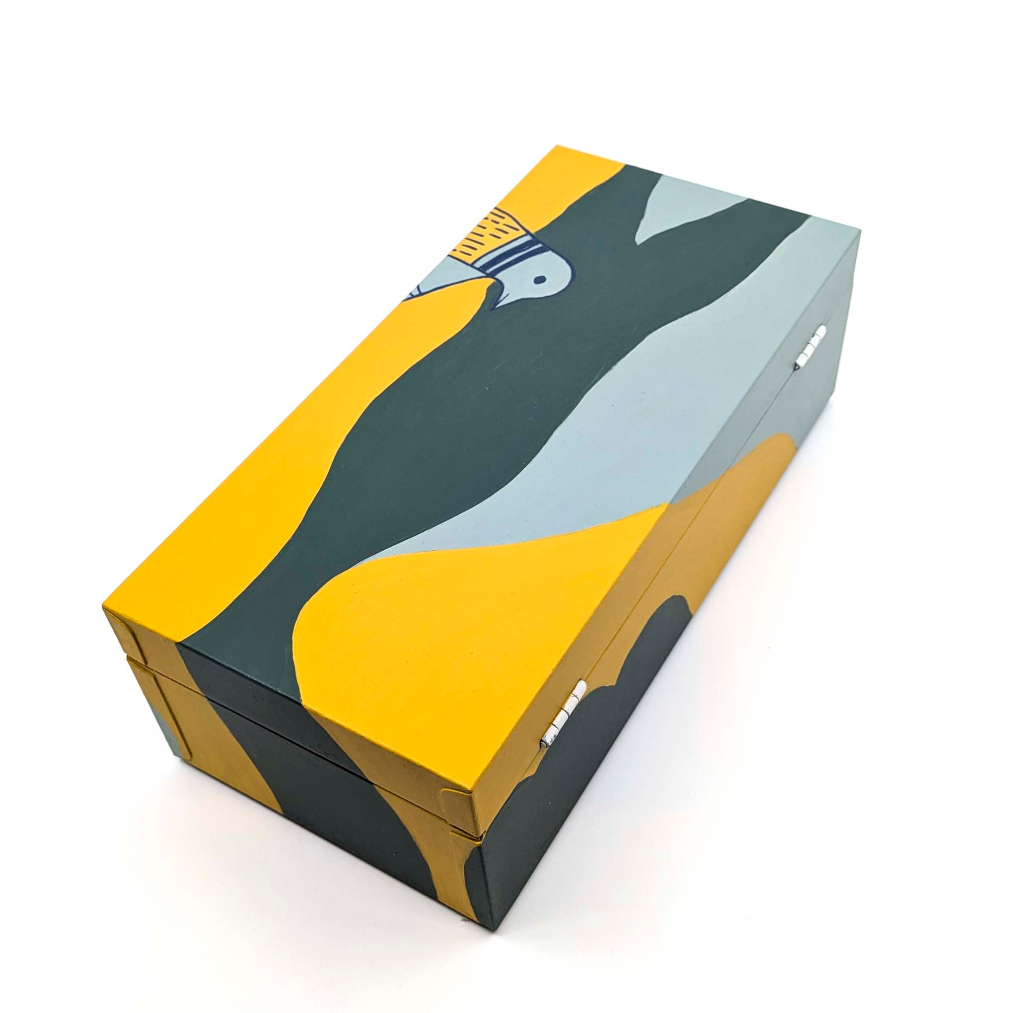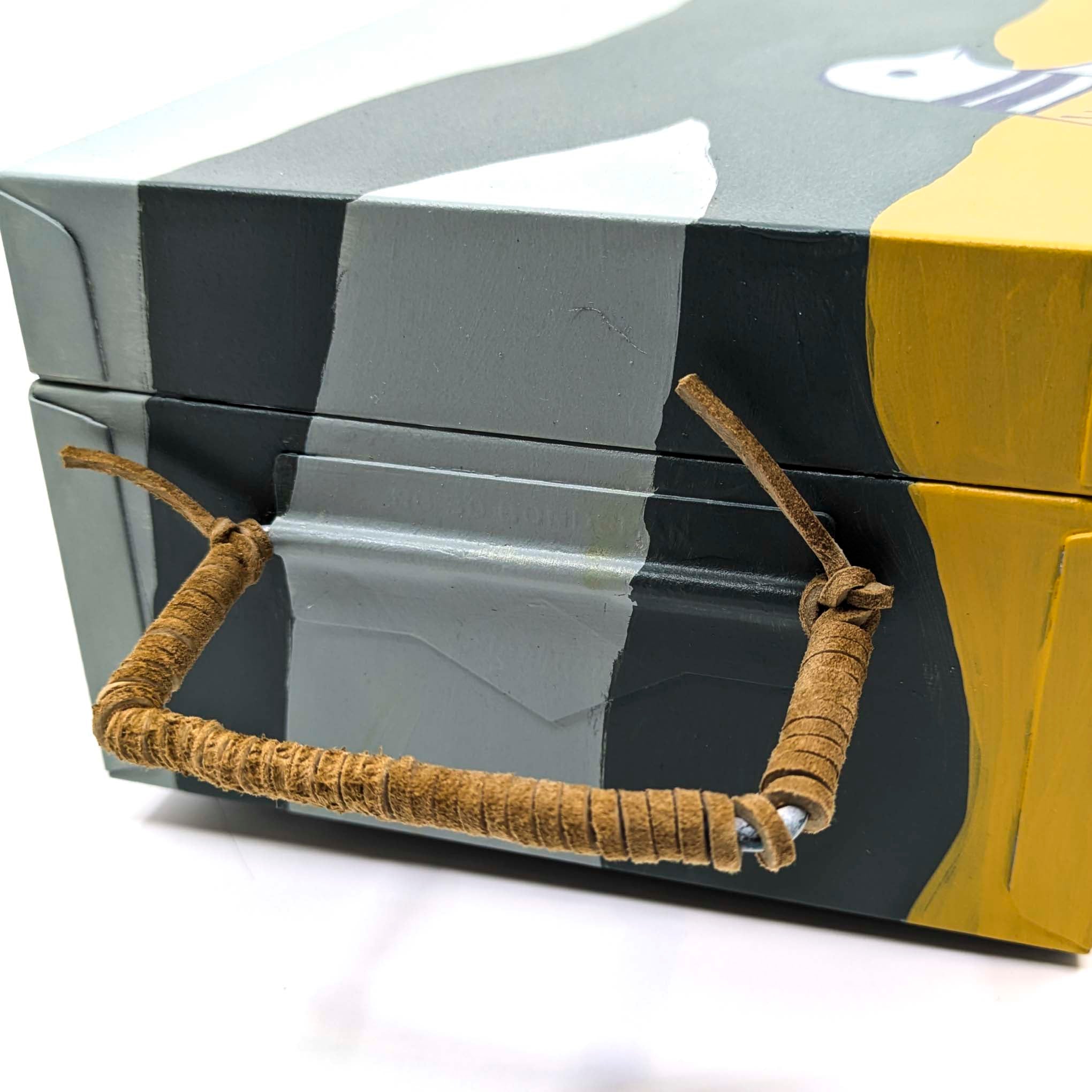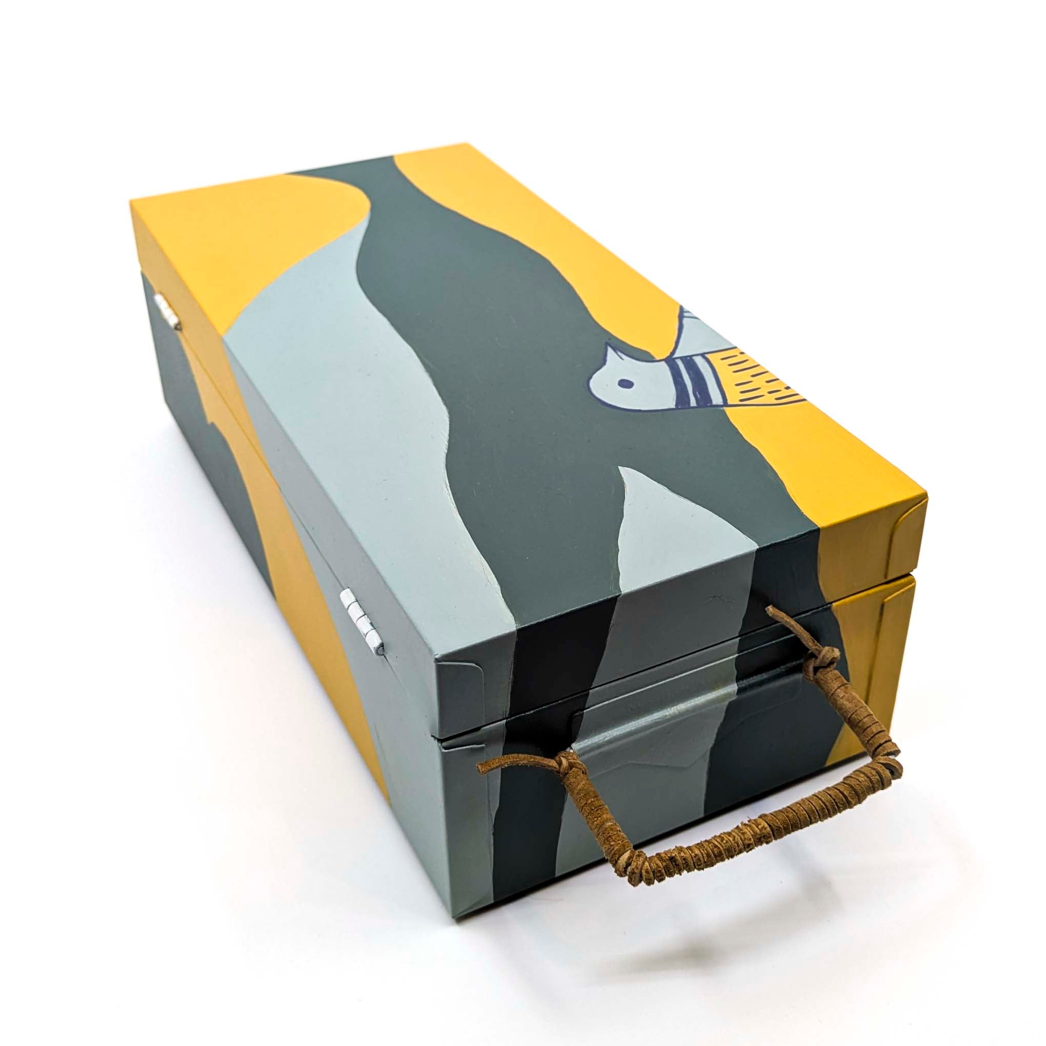 This is a hand painted metal box by North Carolina artist Bethany Hadden.
