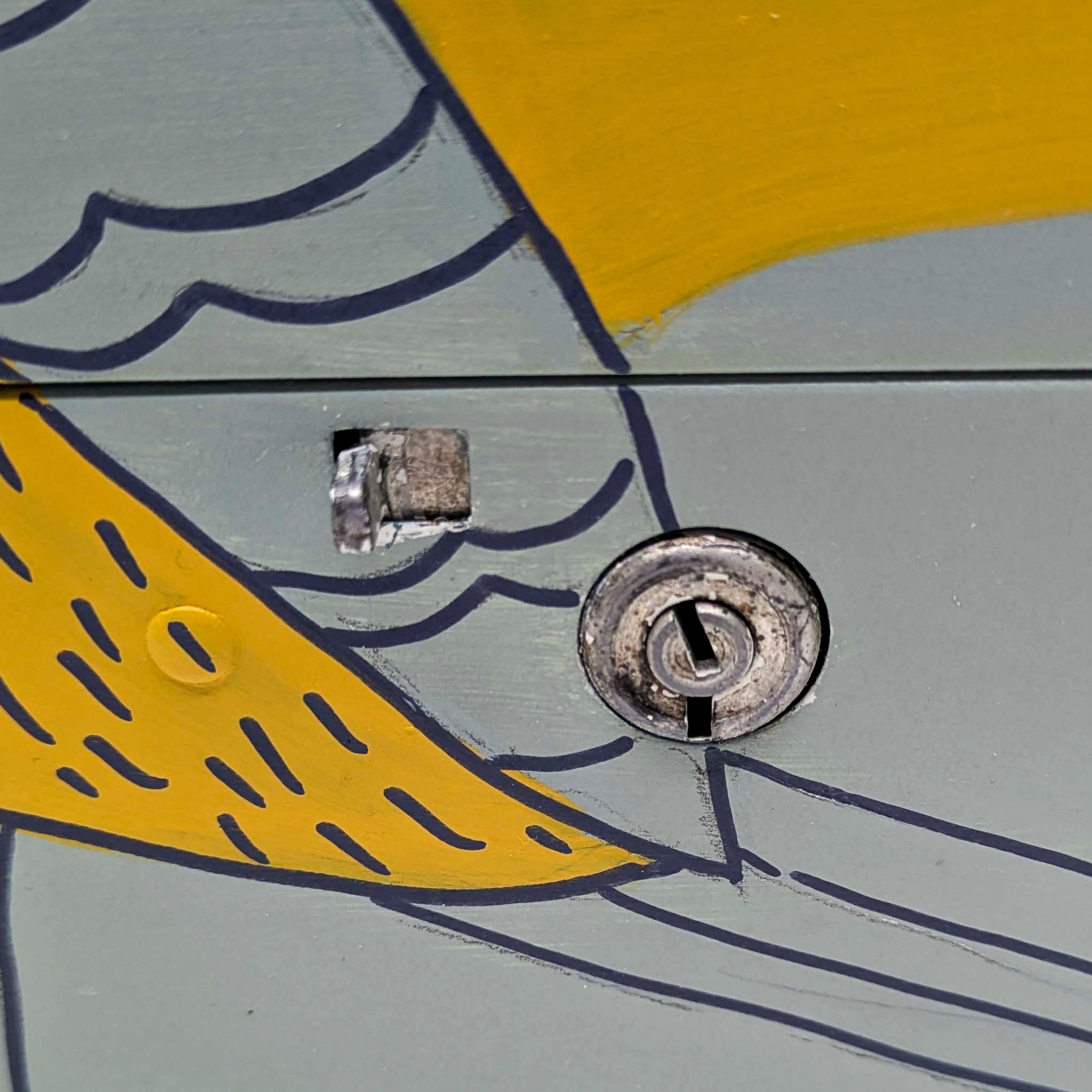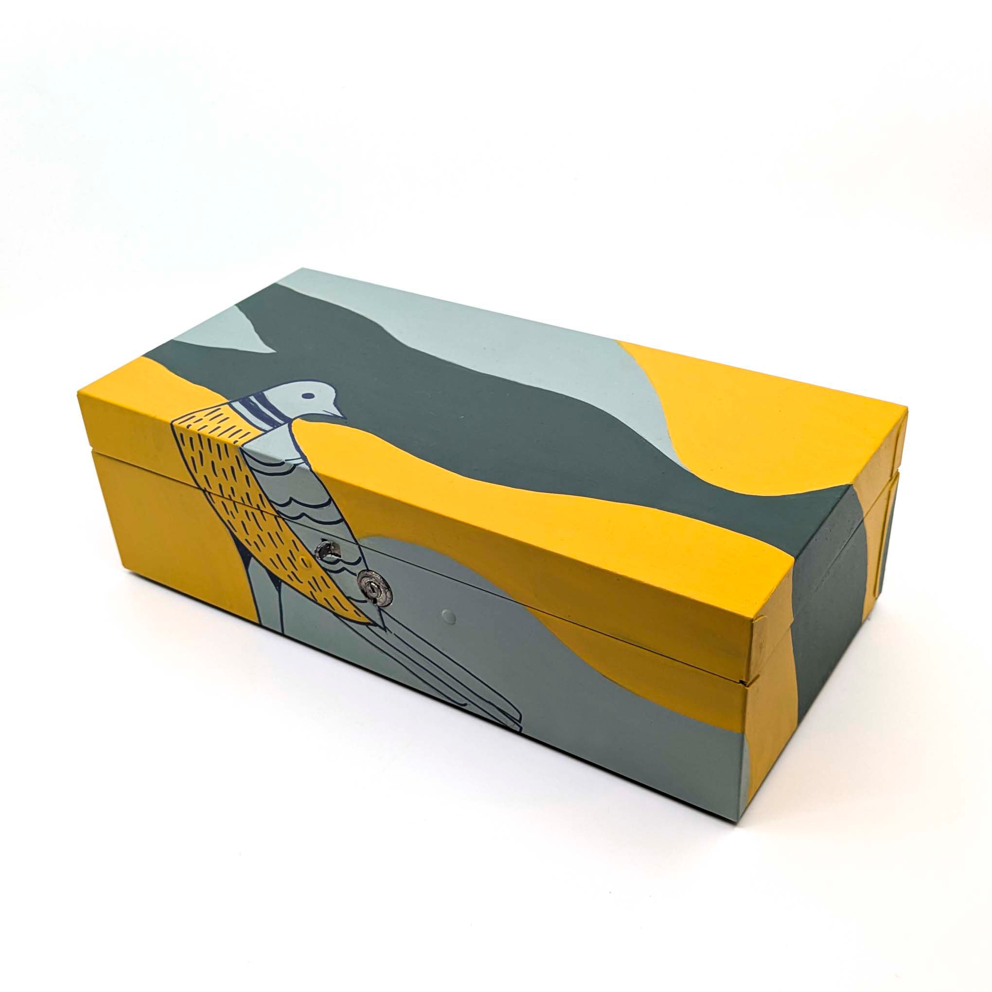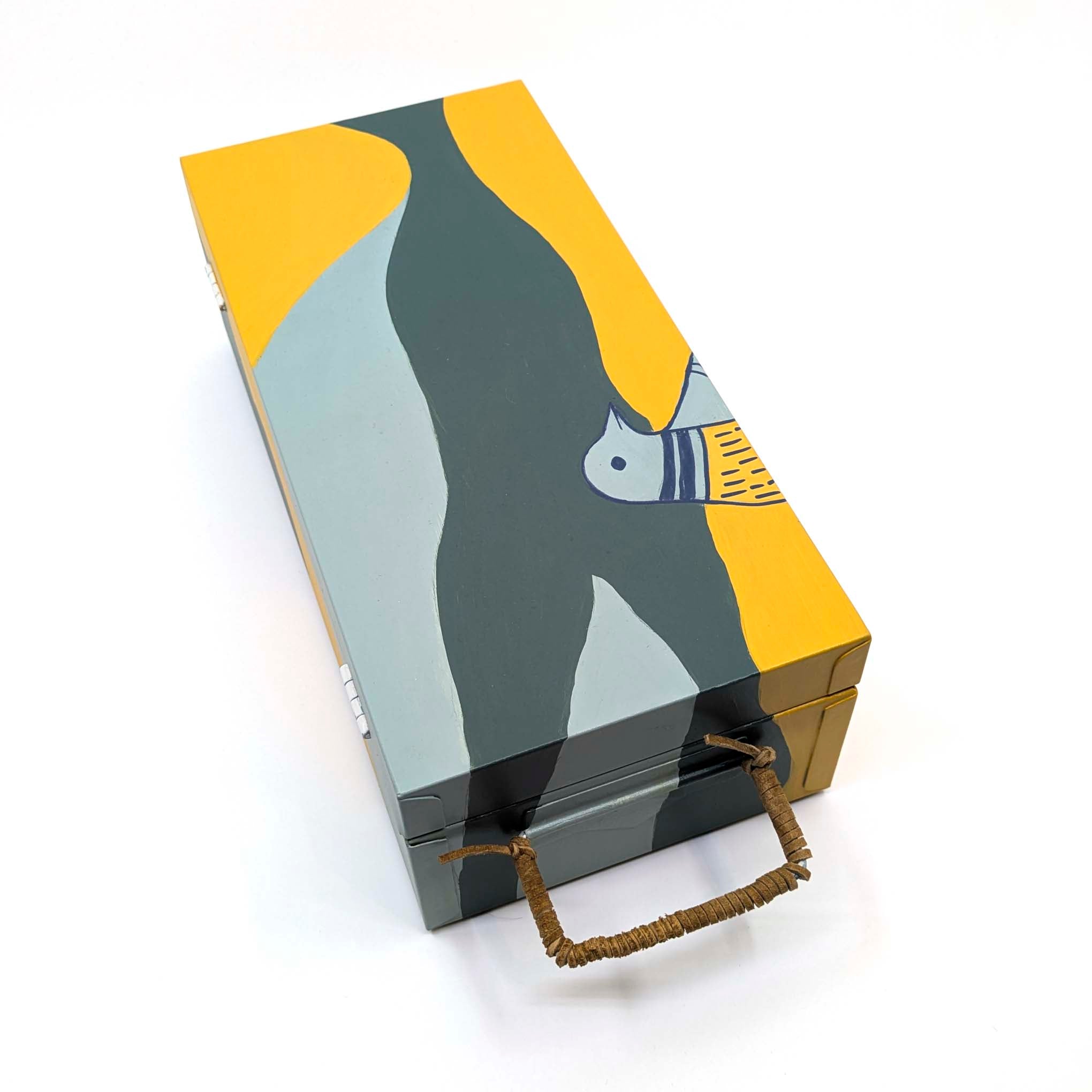 This is a hand painted metal box by North Carolina artist Bethany Hadden.