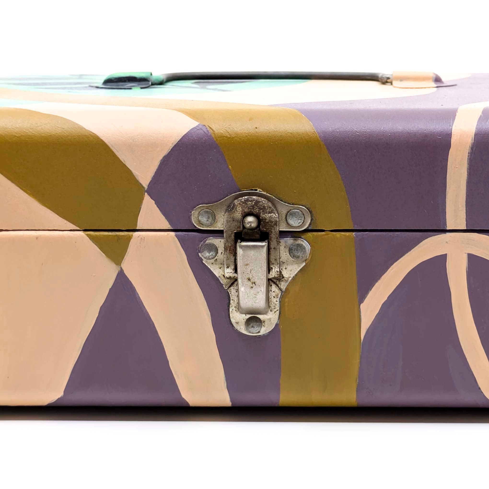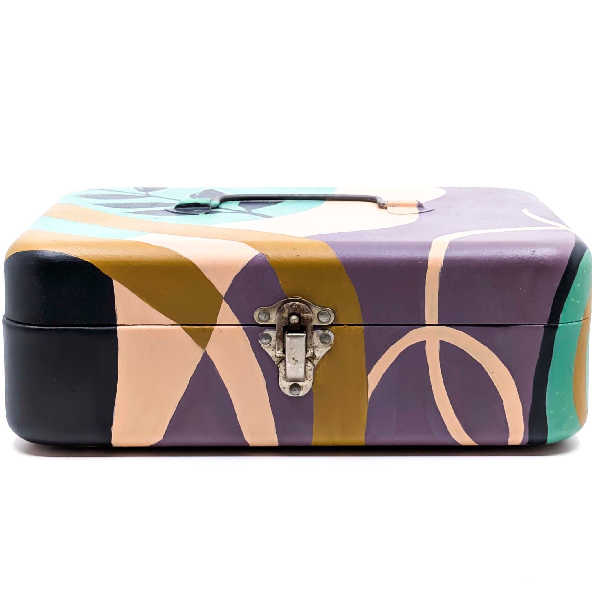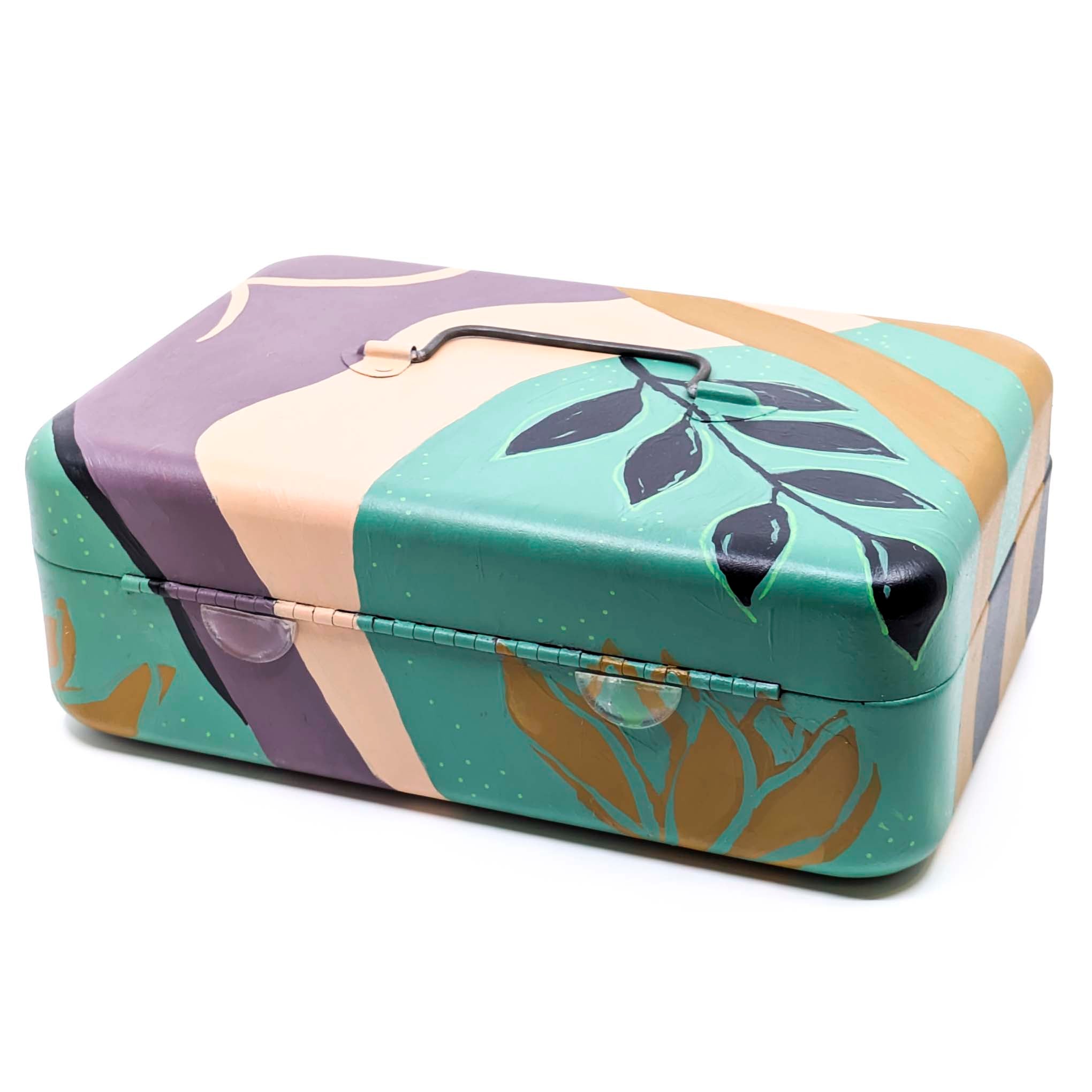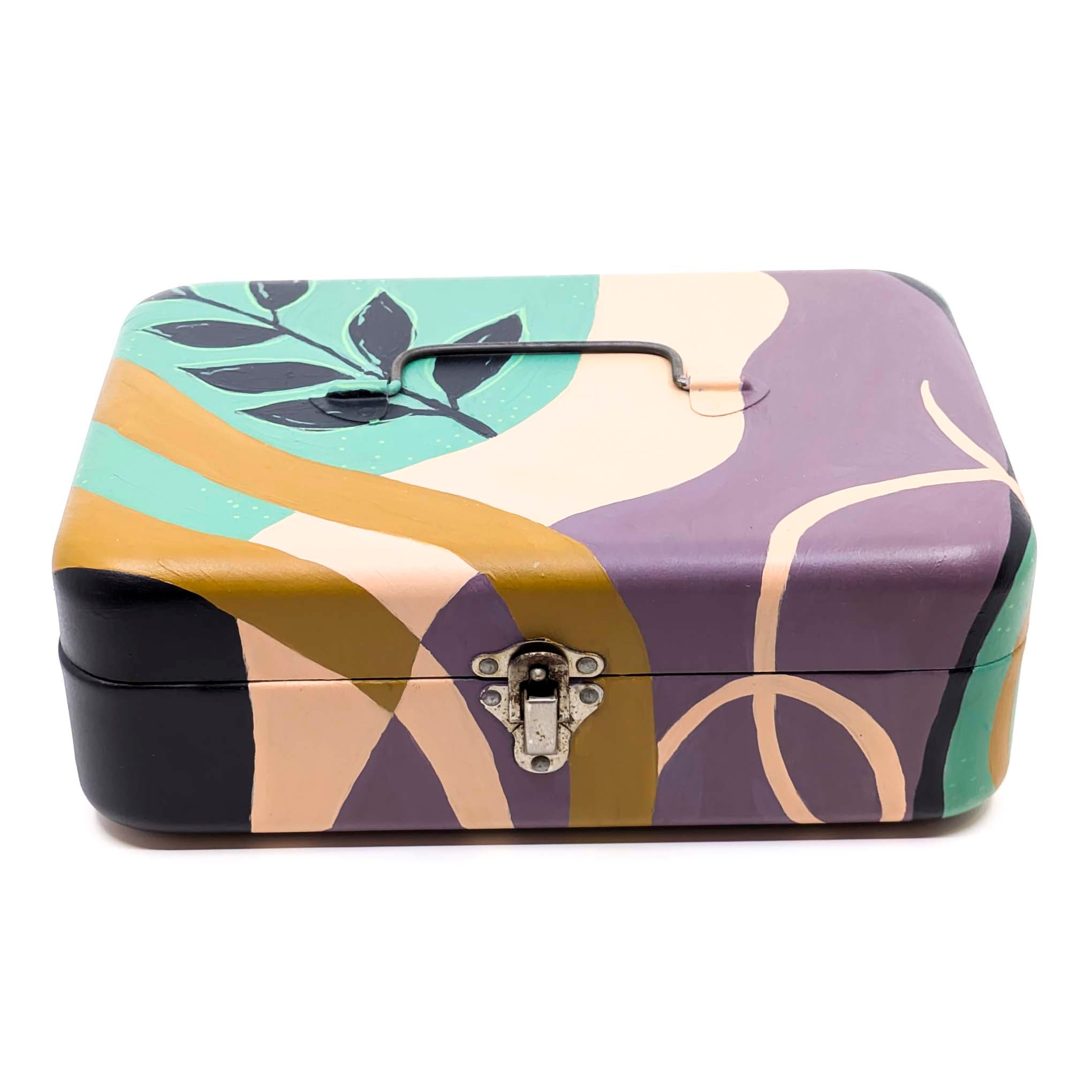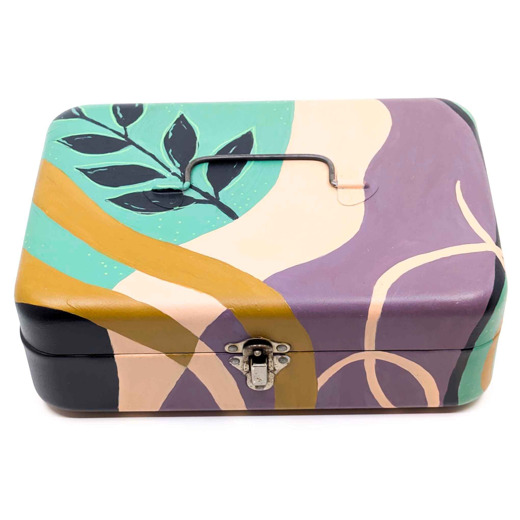 This is a hand painted metal box by North Carolina artist Bethany Hadden.
