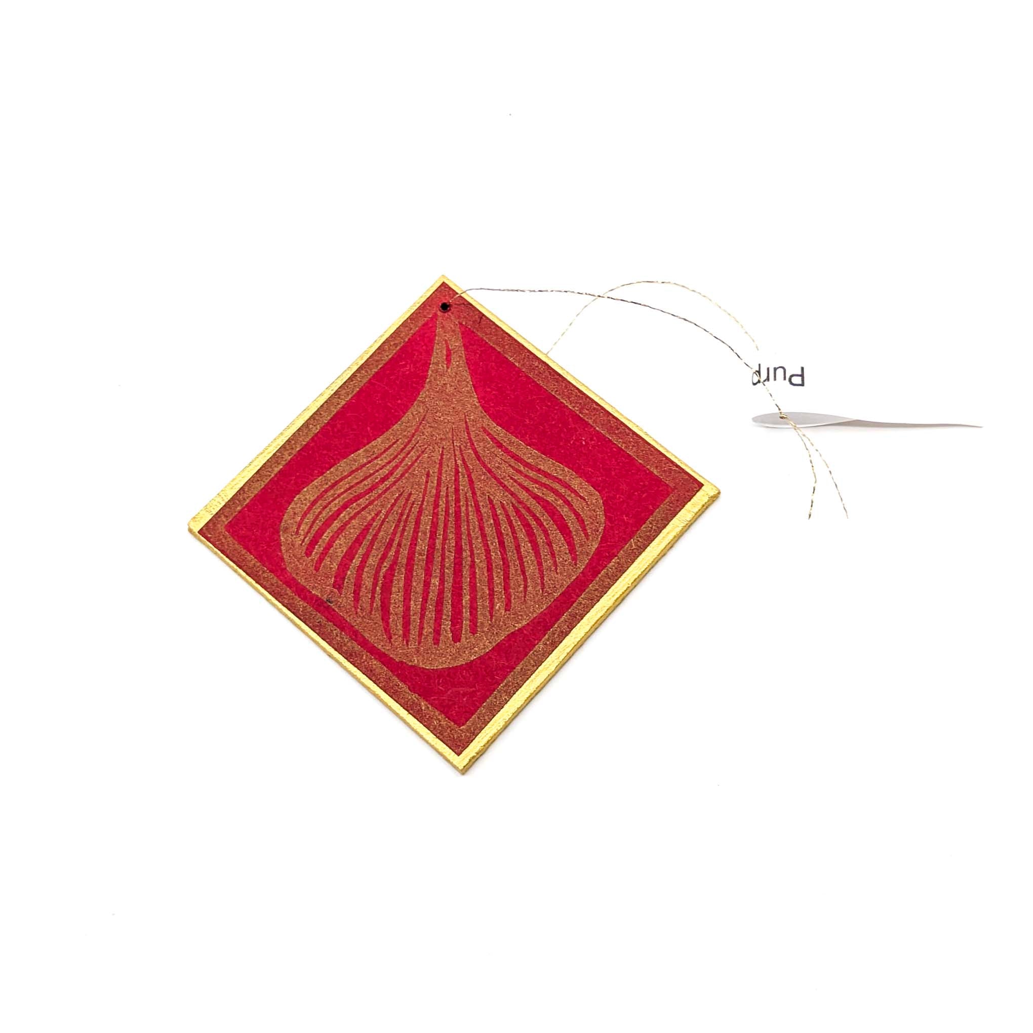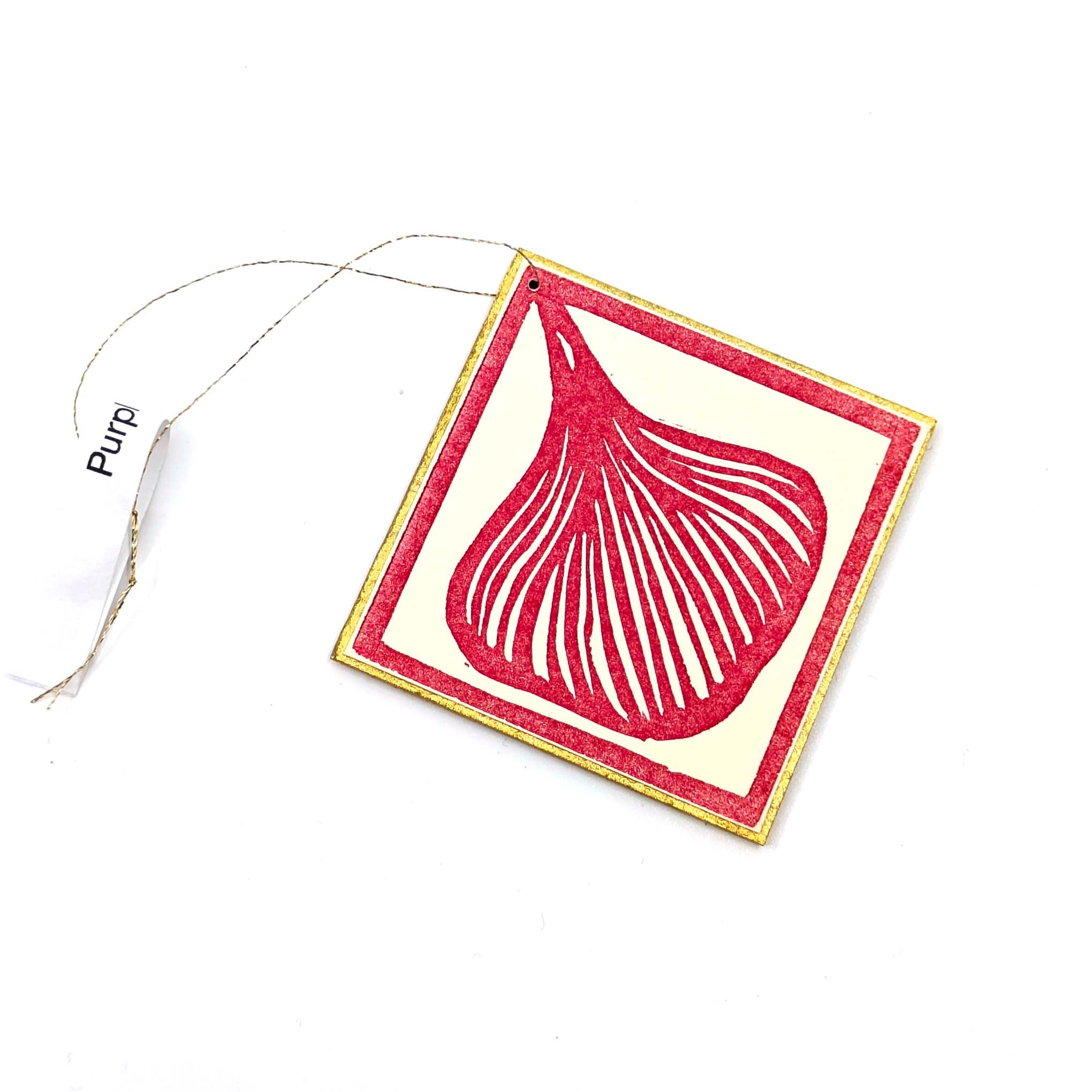 These wooden block printed ornaments are made by North Carolina artist Mary Beth Boone of Purple Pumpkin Press.