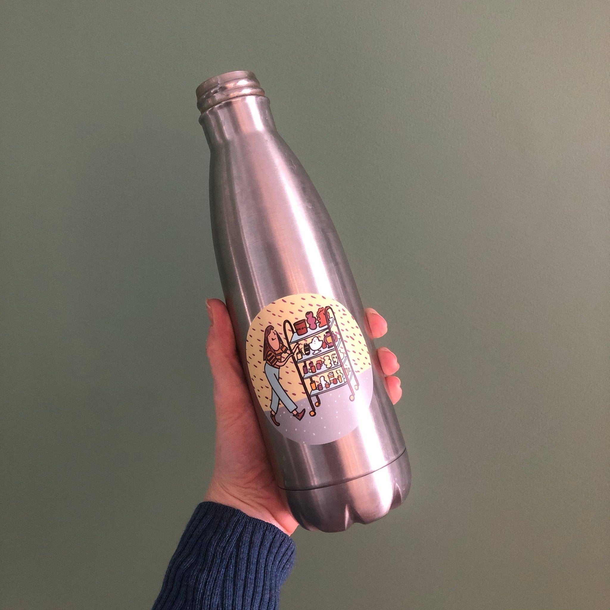 A woman pushes a ware cart, taking care not to push too fast or drop anything! This is a 3" round circle durable vinyl sticker that is scratch, water, and sun resistant. You can even run it through the dishwasher! These stickers do not mess around!