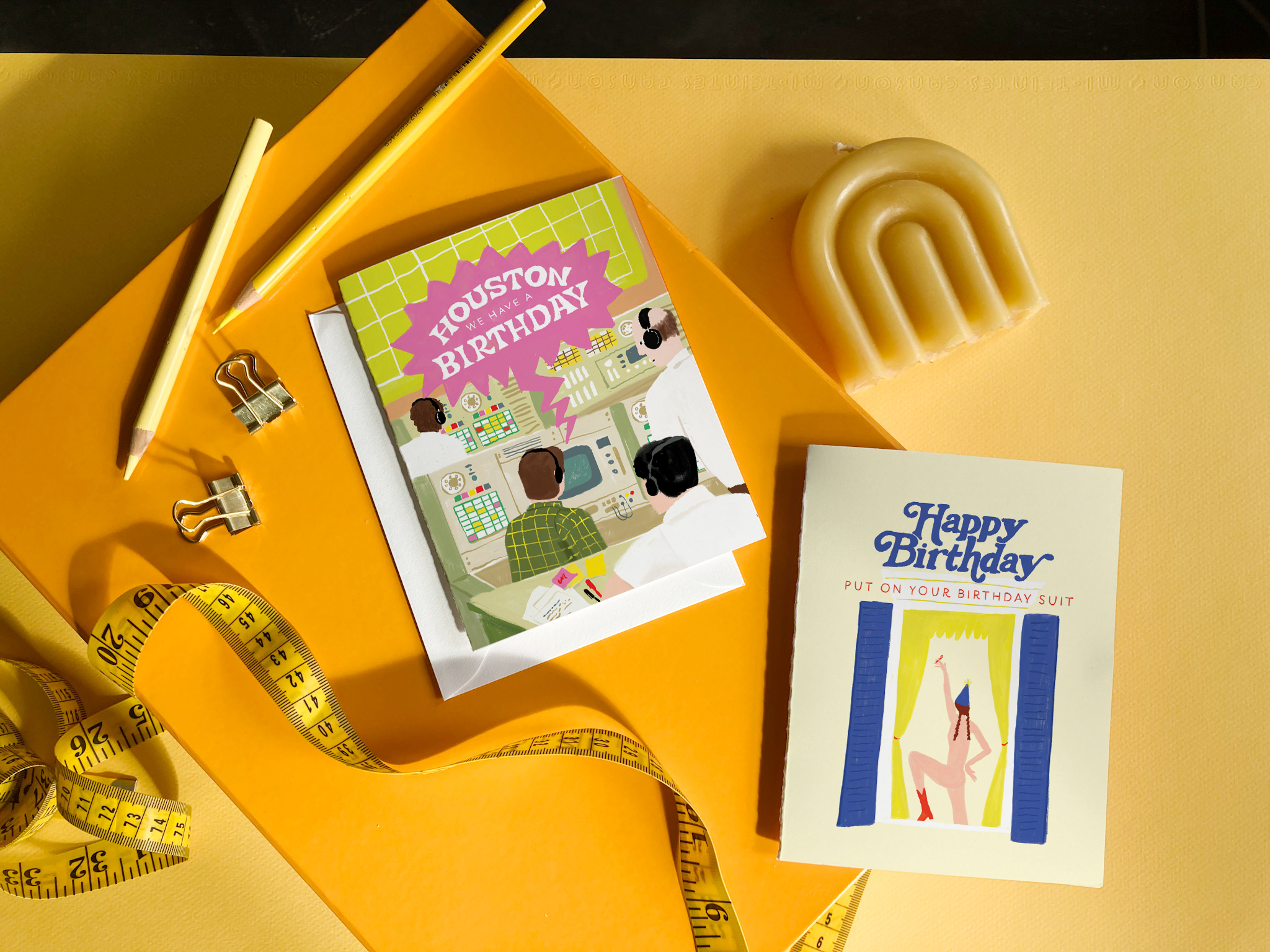 Blast off into birthday mode with this retro space-themed card that brings vintage NASA vibes to the celebration. Featuring four 1960s-era technicians huddled in a control room, this design pairs nostalgic tech with cheeky charm. A speech bubble delivers the celebratory message loud and clear: “Houston, we have a birthday!”—a playful twist on the famous phrase that instantly grabs attention. Perfect for anyone who loves space, engineering, or a little bit of nerdy nostalgia, this card is a clever standout in any birthday section.
